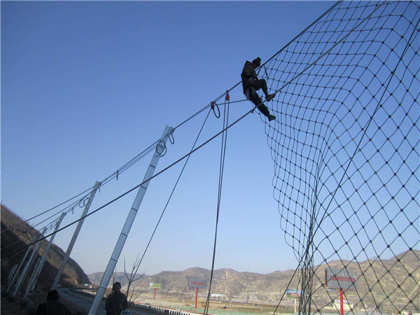 材質(zhì):鋼絲繩網(wǎng)、支撐繩和減壓環(huán)構(gòu)造:由鋼絲繩網(wǎng)或環(huán)形網(wǎng)(需攔截小塊落石時附加一層鐵絲格柵)、固定系統(tǒng)(錨桿、攔錨繩、基座和支撐繩)、減壓環(huán)和鋼柱四個主要部分構(gòu)成。