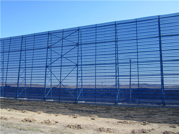 原理:利用空氣動(dòng)力學(xué)原理,按照實(shí)施現(xiàn)場(chǎng)環(huán)境風(fēng)洞實(shí)驗(yàn)結(jié)果加工成一定幾何形狀的擋風(fēng)板,并根據(jù)現(xiàn)場(chǎng)條件將擋風(fēng)板組合成擋風(fēng)抑塵墻,使流通的空氣(強(qiáng)風(fēng))從外通過(guò)墻體時(shí),在墻體內(nèi)側(cè)形成上、下干擾的氣流,以達(dá)到外側(cè)強(qiáng)風(fēng),風(fēng)側(cè)弱風(fēng);外側(cè)小風(fēng),內(nèi)側(cè)無(wú)風(fēng)的效果,從而防止粉塵的飛揚(yáng)。該技術(shù)設(shè)計(jì)中對(duì)多種具有不同形狀和開孔率的擋風(fēng)抑塵板進(jìn)行風(fēng)洞效果檢測(cè),結(jié)果表明蝶形擋風(fēng)板在一定的開孔率下,其具有明顯降低風(fēng)速和風(fēng)力的作用。擋風(fēng)抑塵墻的設(shè)計(jì)當(dāng)氣流通過(guò)每塊擋風(fēng)抑塵板時(shí),氣流將按擋風(fēng)板的開孔通過(guò)。